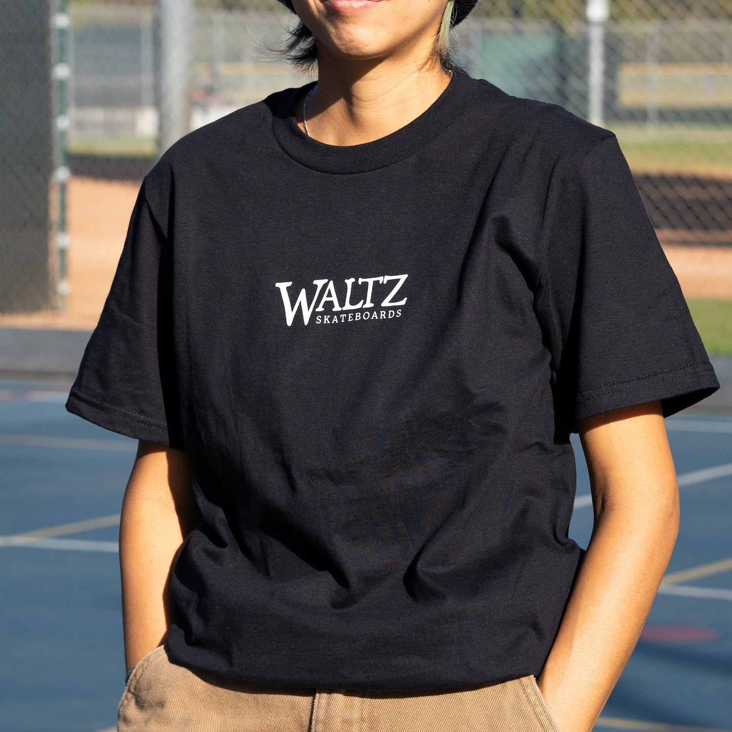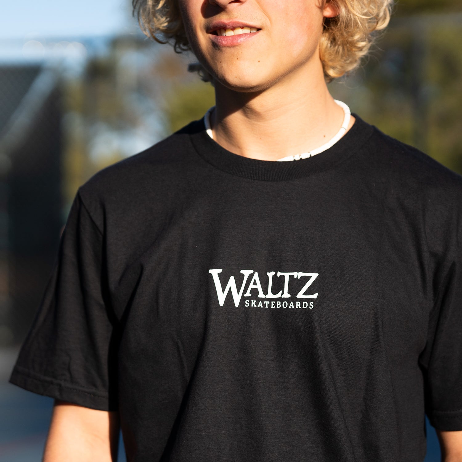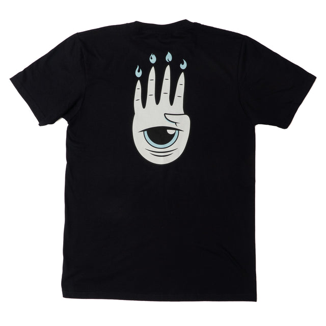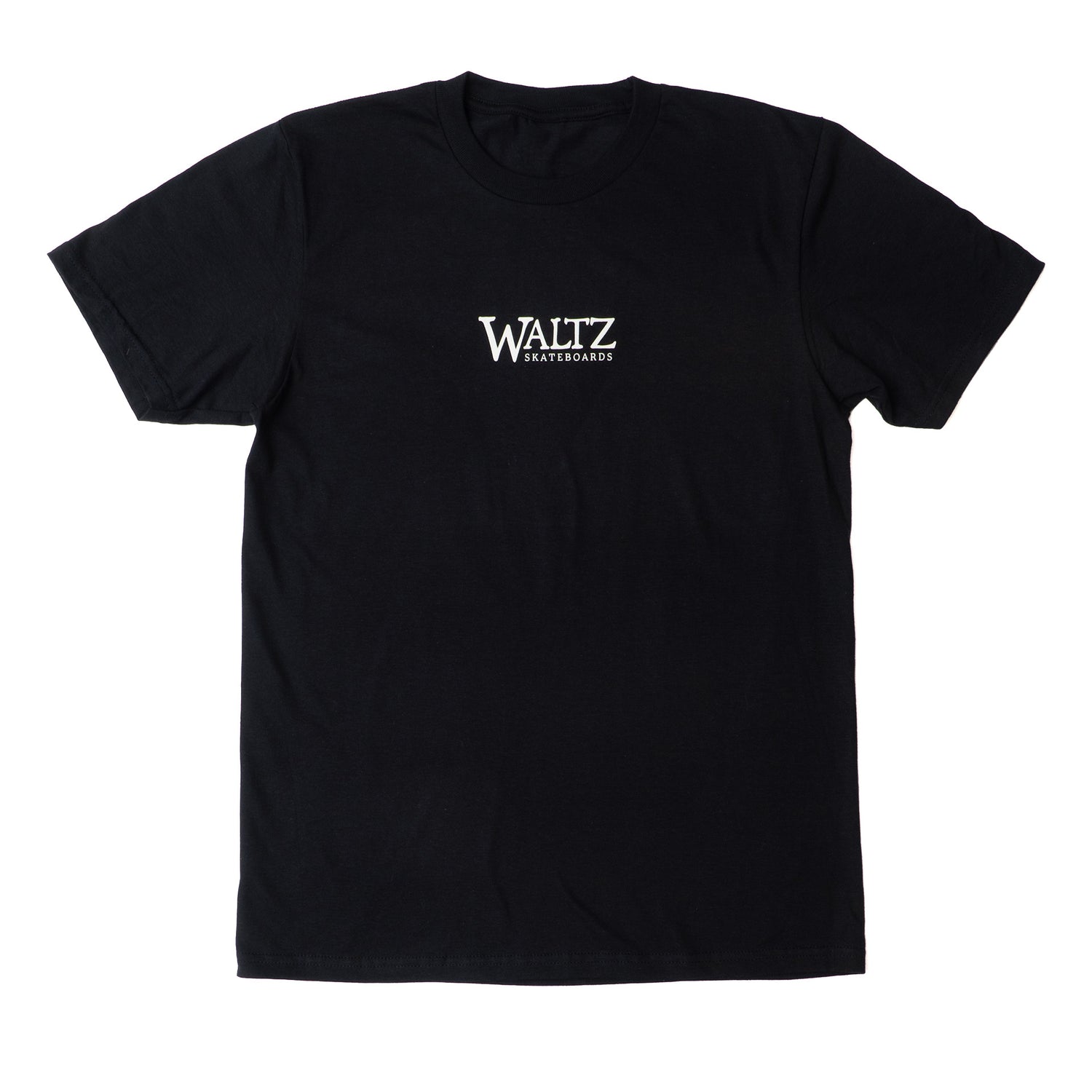 Light gray, blue, and black ink on black, 100% cotton t-shirt