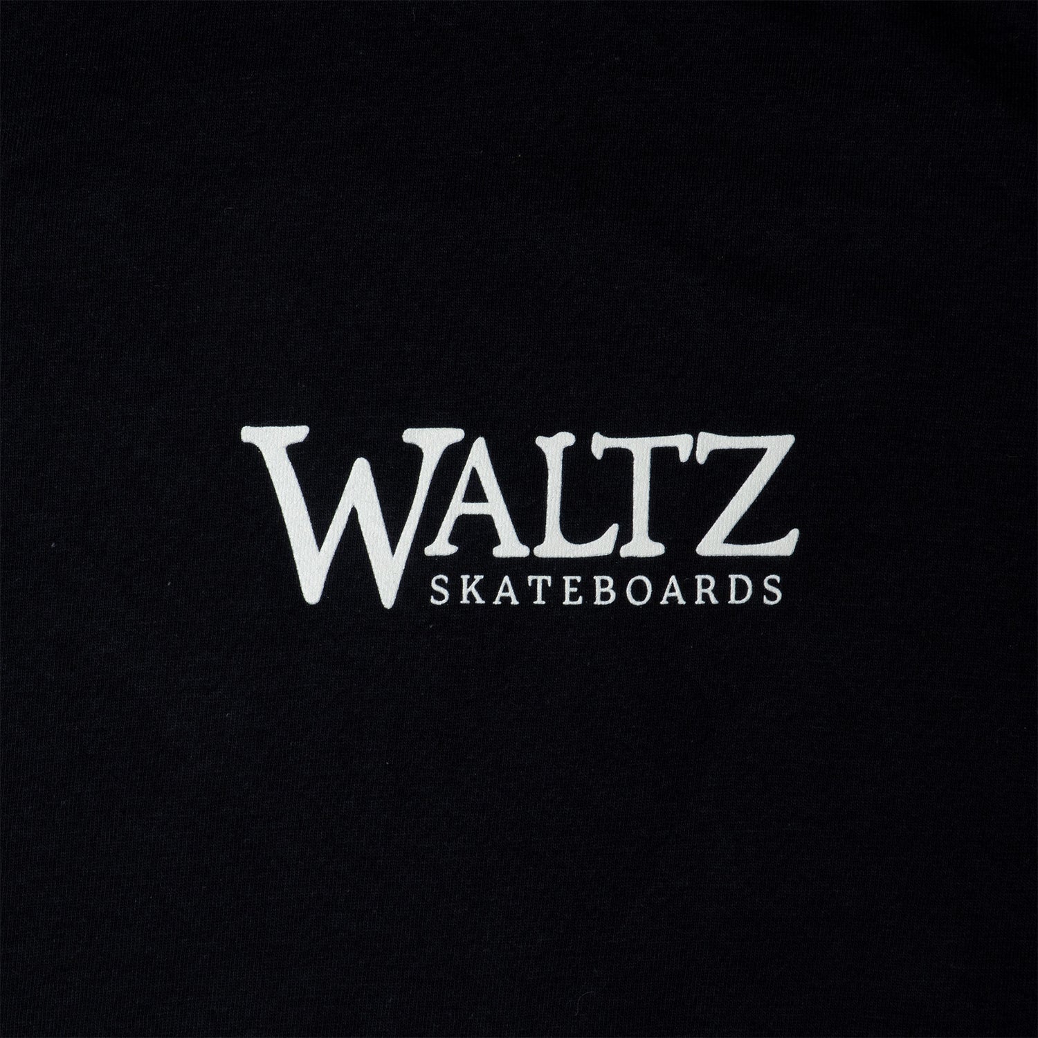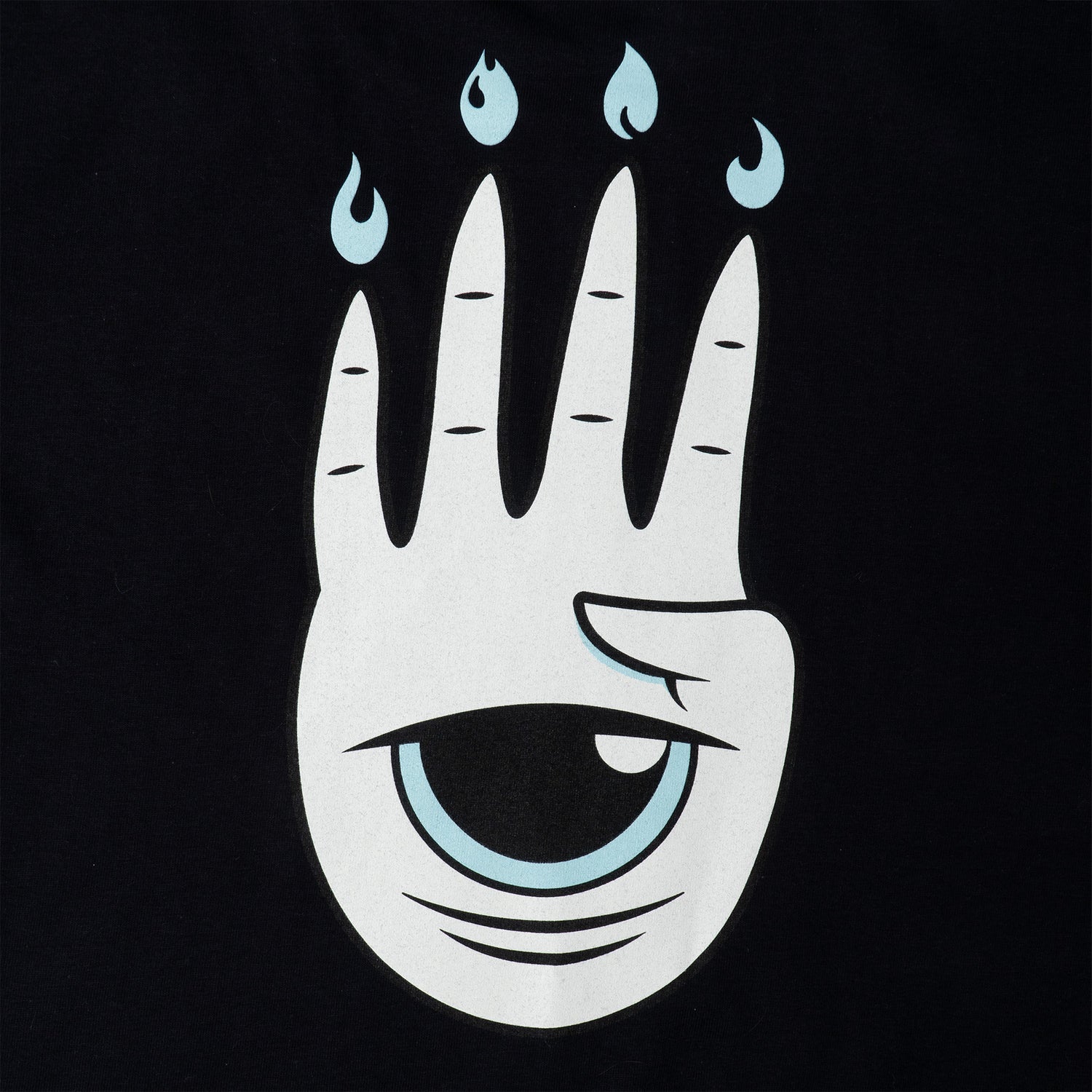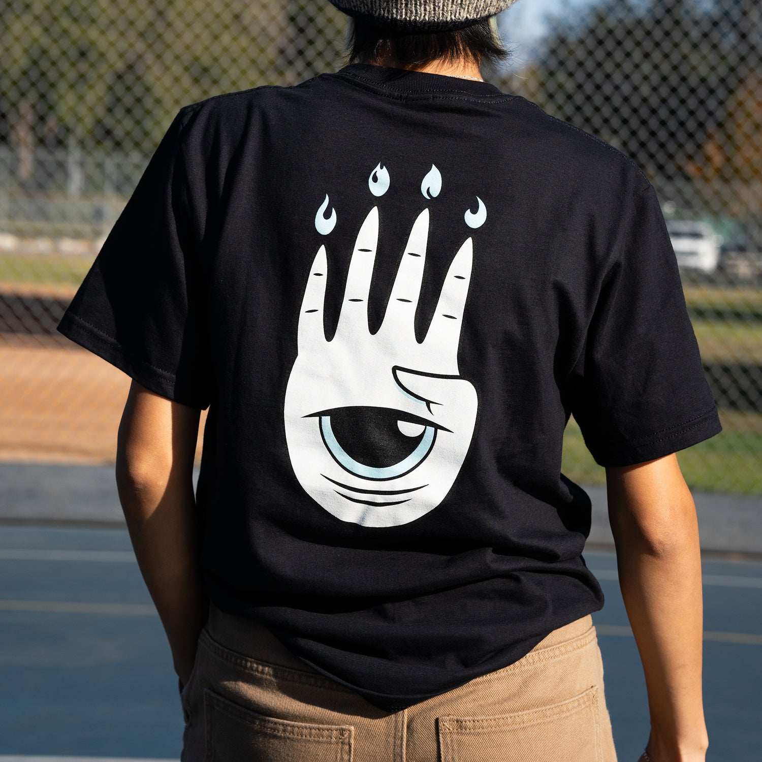 Light gray, blue, and black ink on black, 100% cotton t-shirt